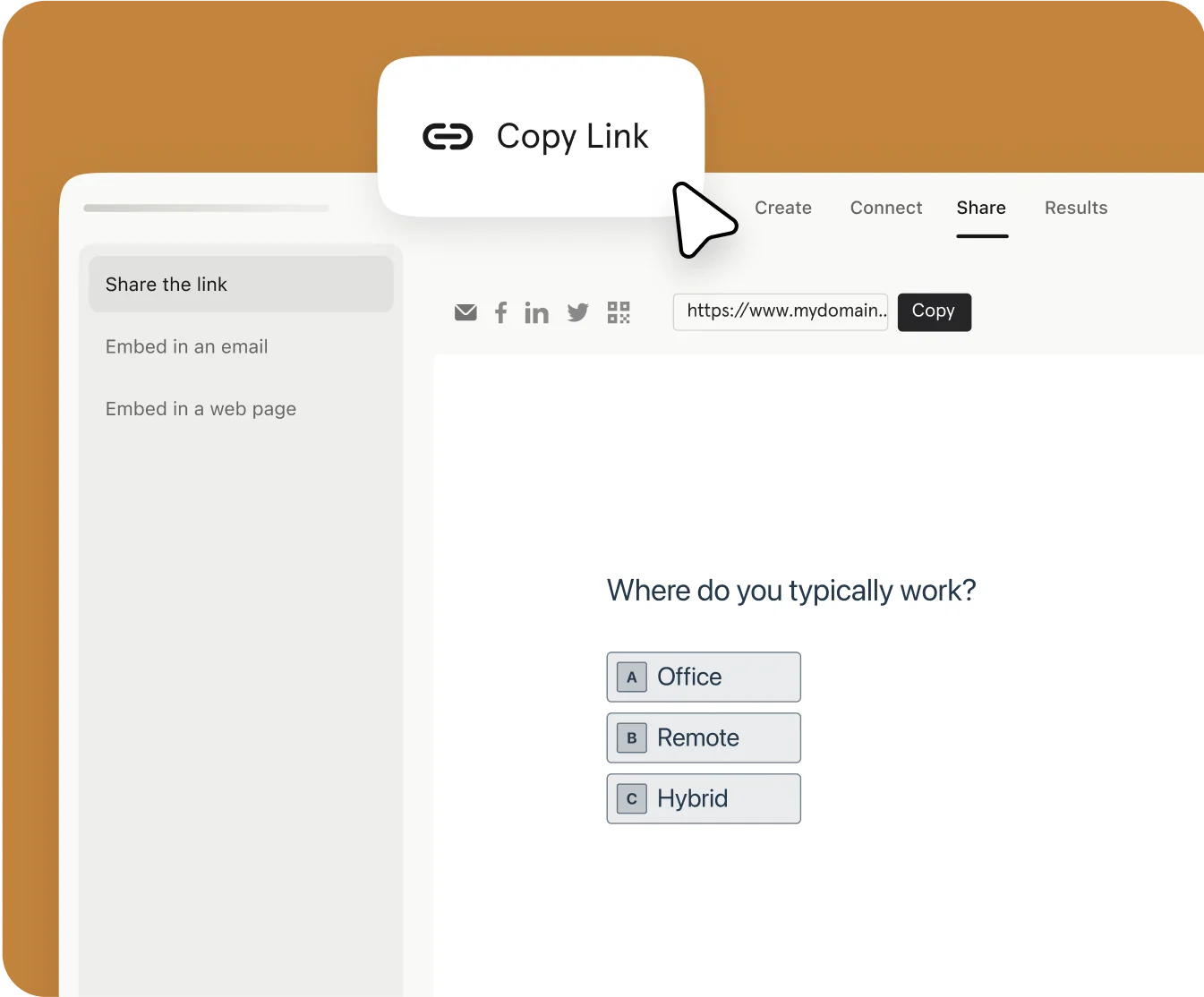 Inserta un enlace para publicar tu encuesta en redes sociales, o copia el código listo para usar en correos electrónicos y páginas de destino.